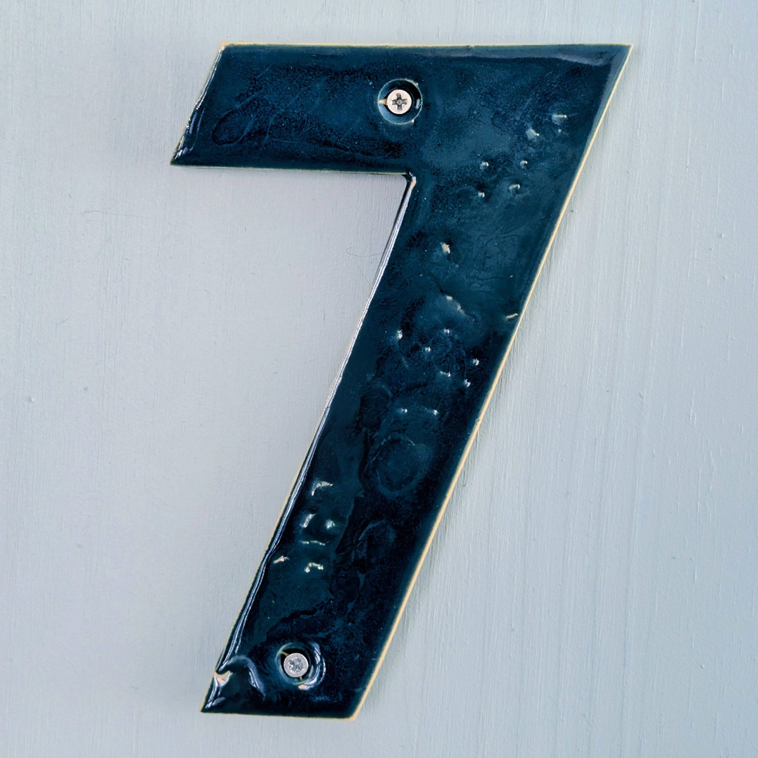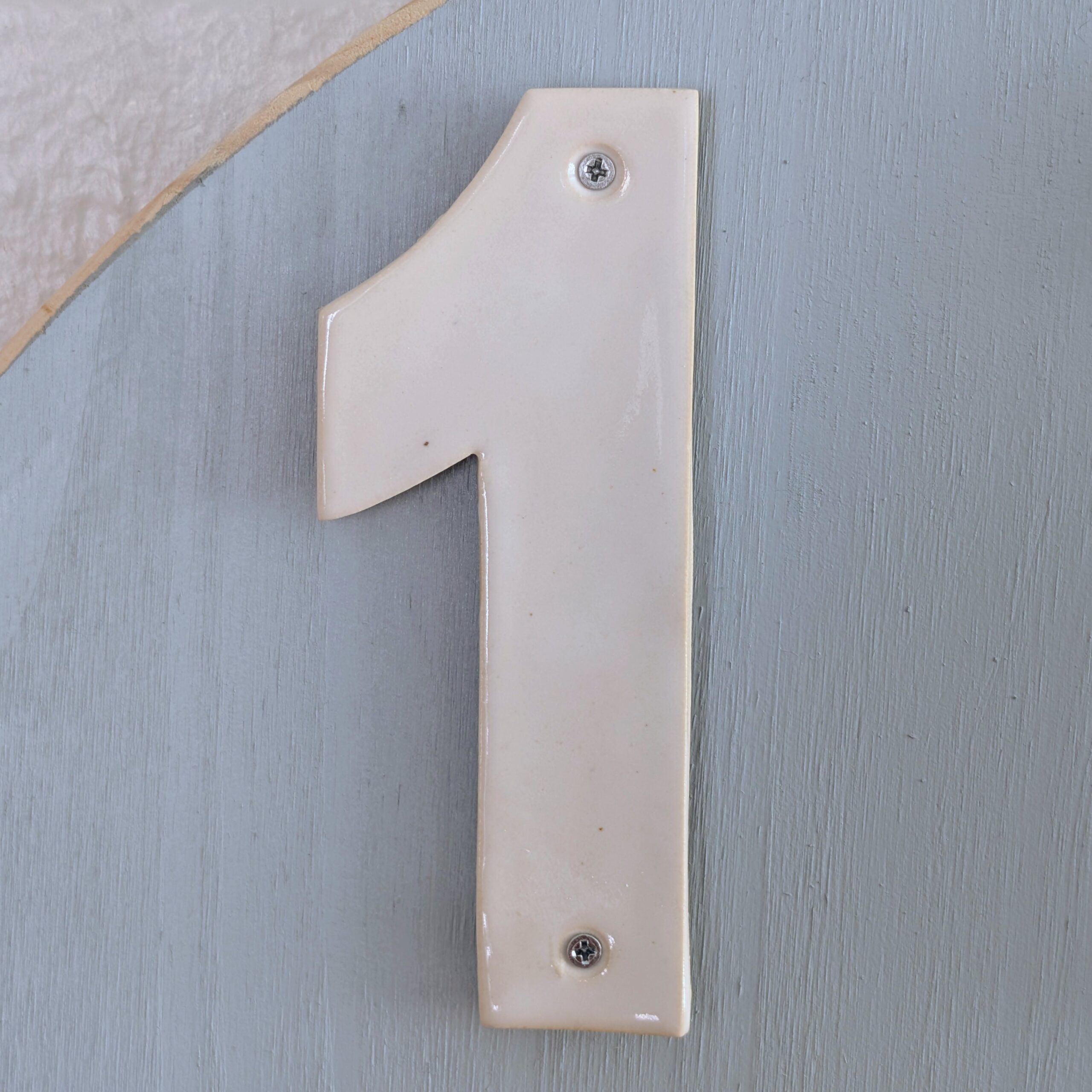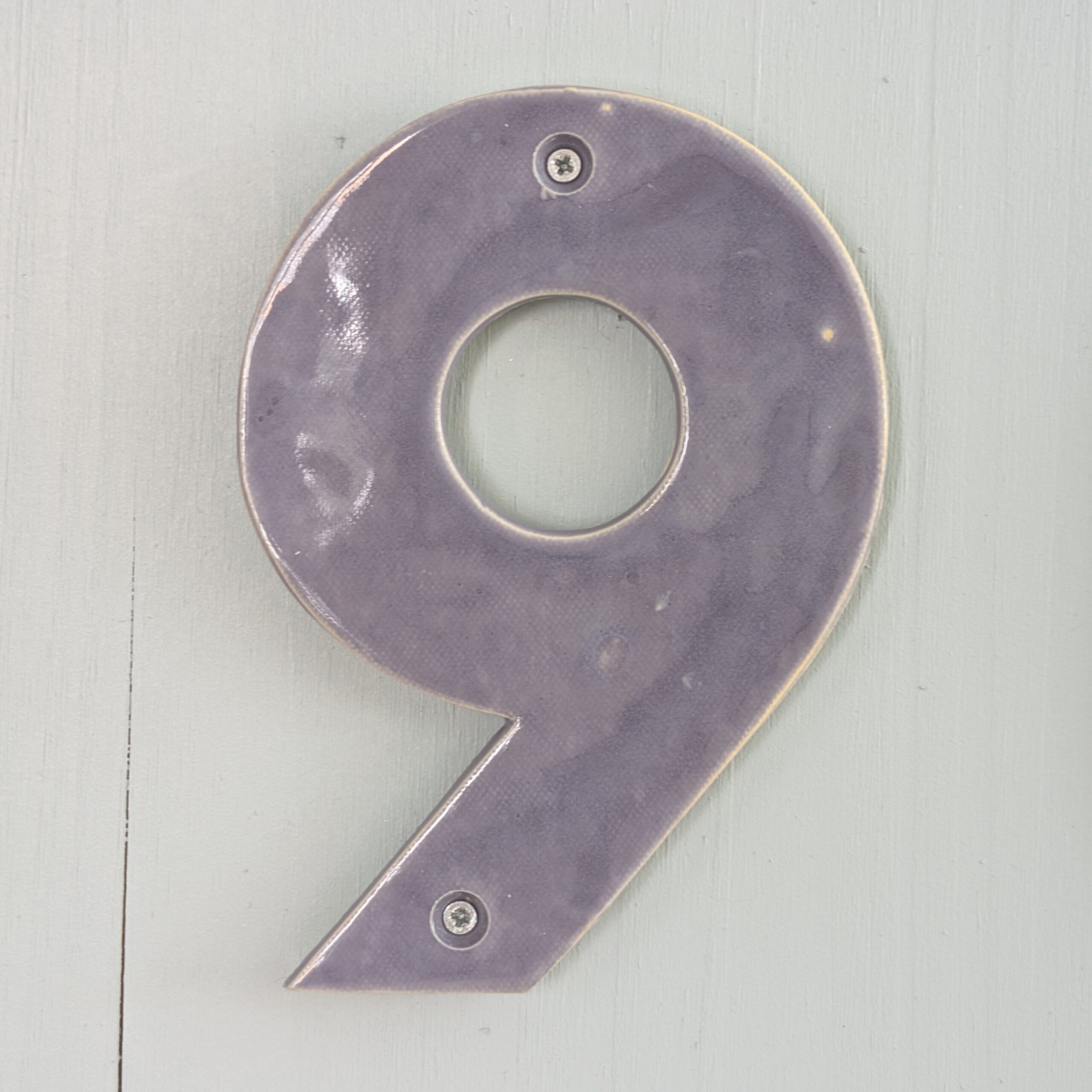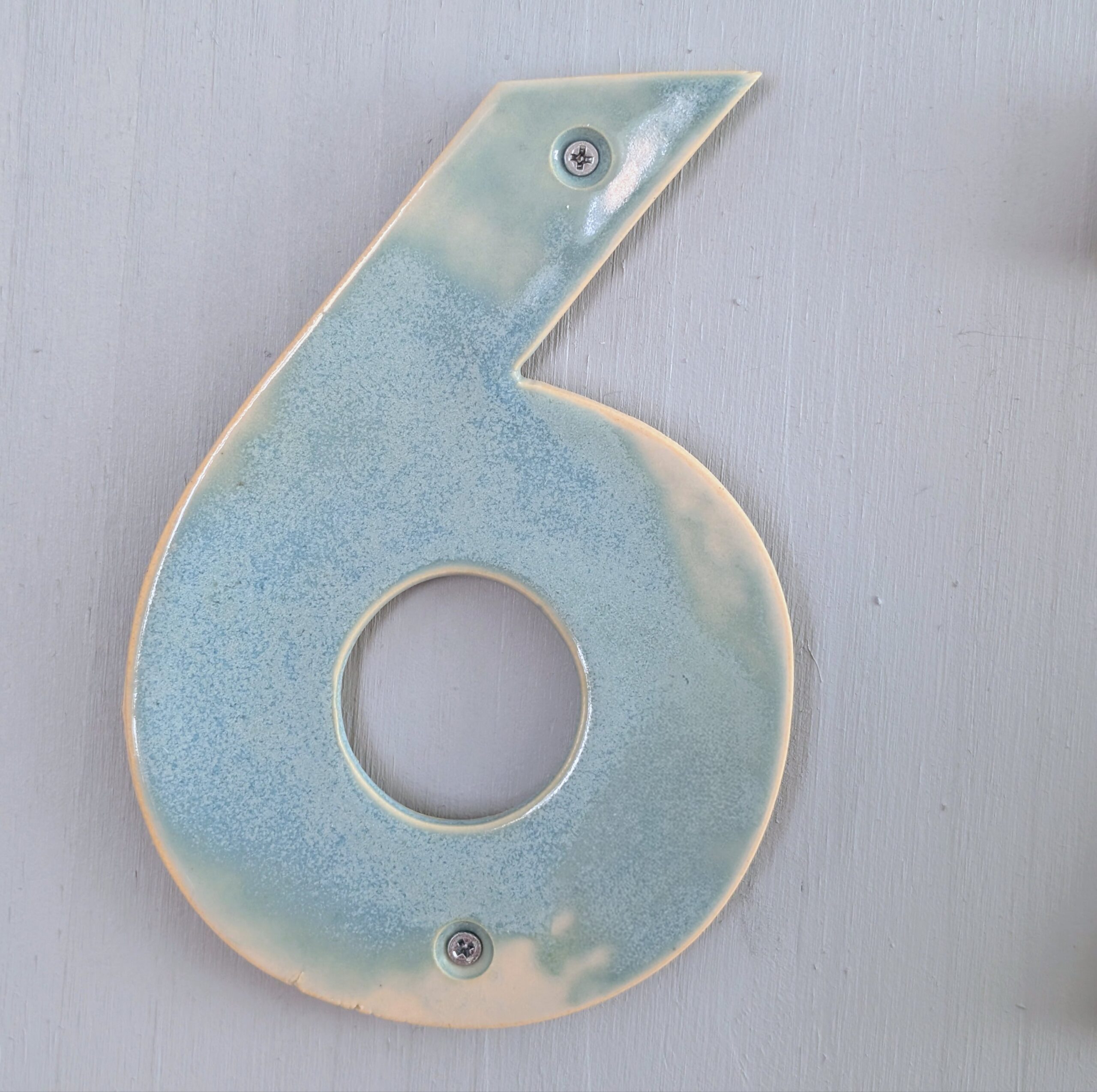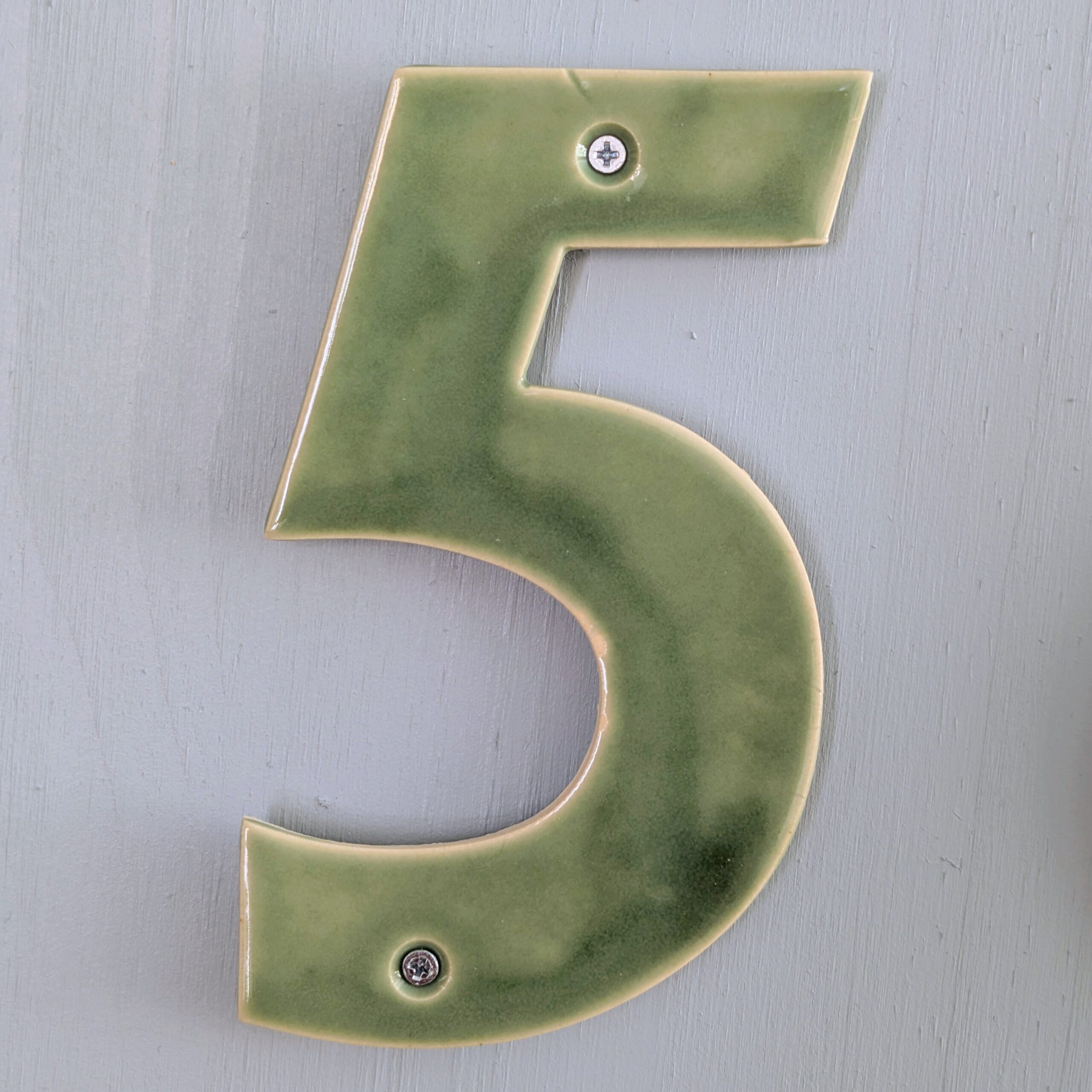 Handmade ceramic house numbers, 5.5 inches tall. Available in 10 glaze colors: snow, cherry, sunset, buttercup, jade, turquoise, peacock, sapphire, lavender and coal. Each number comes with 2 screws, spacers to lift them above the mounting surface and matching paint to disguise the screws.